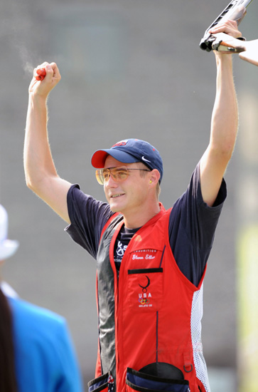 8月12日,美國選手埃勒在決賽獲勝后慶祝。當(dāng)日,北京奧運(yùn)會射擊男子飛碟雙多向決賽在北京射擊館飛碟靶場舉行,美國選手埃勒奪金。