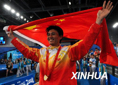 8月12日,中國(guó)選手仲滿披上五星紅旗,慶祝勝利。當(dāng)晚,中國(guó)選手仲滿在國(guó)家會(huì)議中心擊劍館舉行的北京奧運(yùn)會(huì)男子佩劍個(gè)人決賽中戰(zhàn)勝法國(guó)選手尼古拉·洛佩,獲得冠軍。這是中國(guó)男子擊劍在奧運(yùn)歷史上的第一金。新華社記者
