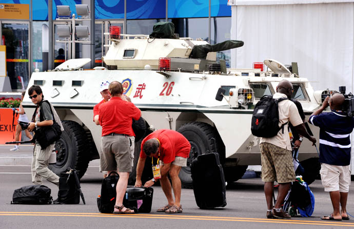 8月12日,記者在拍攝裝甲運(yùn)兵車(chē)。當(dāng)日,一輛安保裝甲運(yùn)兵車(chē)停在北京奧運(yùn)會(huì)新聞中心(MPC)安檢口,成為媒體關(guān)注的焦點(diǎn)。許多記者還饒有興趣地與之合影留念,感受一下這位“裝甲明星”的威風(fēng)。