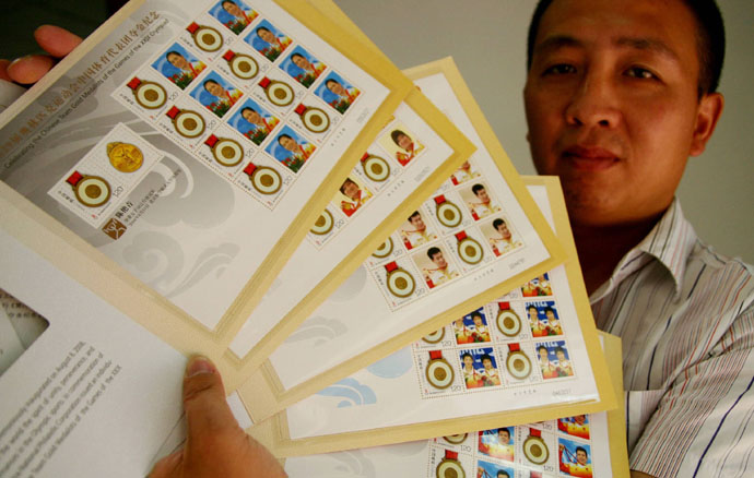 8月13日,安徽巢湖的一名集郵愛好者展示購買到的“金牌運動員”即時版?zhèn)性化郵折。中國集郵總公司在北京奧運會期間發(fā)行“金牌成就夢想”第29屆奧林匹克運動會中國體育代表團奪金紀(jì)念郵品(簡稱“金牌運動員”郵品),包括“金牌運動員”即時版?zhèn)性化郵折和“金牌運動員”紀(jì)念封,個性化郵折力爭在運動員獲得金牌后48小時內(nèi)發(fā)行銷售,受到廣大集郵愛好者的青睞。