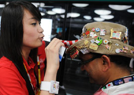 8月14日,在北京地鐵里,“章迷”們在互換奧運紀念章。奧運會,也是來自世界各地的奧運紀念章迷們的盛會。大家在北京互換紀念章,“以章會友”,共同享受奧運帶來的快樂。