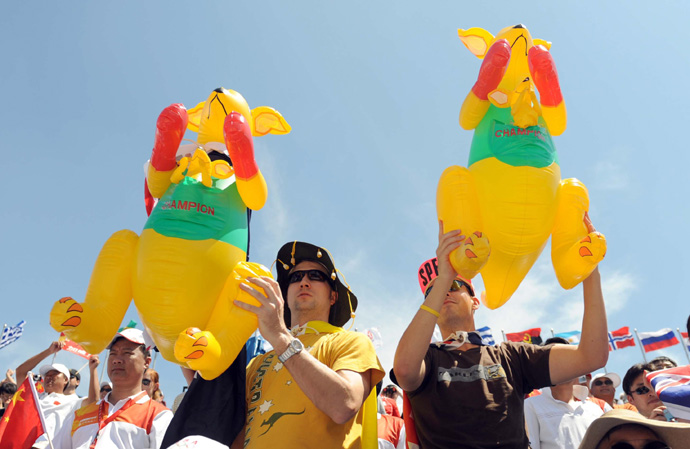 8月15日,兩名澳大利亞球迷手舉充氣袋鼠玩具在朝陽公園沙灘排球場(chǎng)為澳大利亞隊(duì)加油。當(dāng)日,澳大利亞隊(duì)娜塔莉·庫克/塔姆辛·巴尼特以2比1戰(zhàn)勝希臘隊(duì)埃夫沙利婭·庫特魯馬尼祖/瑪麗亞·齊亞爾齊亞尼,晉級(jí)八強(qiáng)。