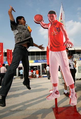 8月15日,一位年輕人在主題公園內和“姚明”一比高下。