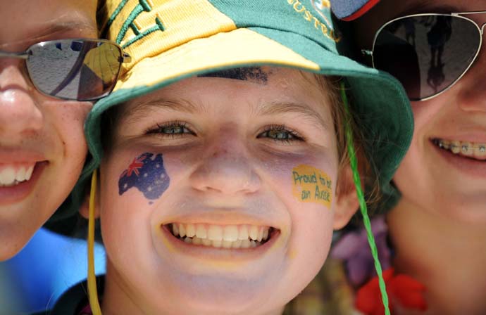 8月15日,一名澳大利亞小球迷在朝陽公園沙灘排球場觀看比賽。