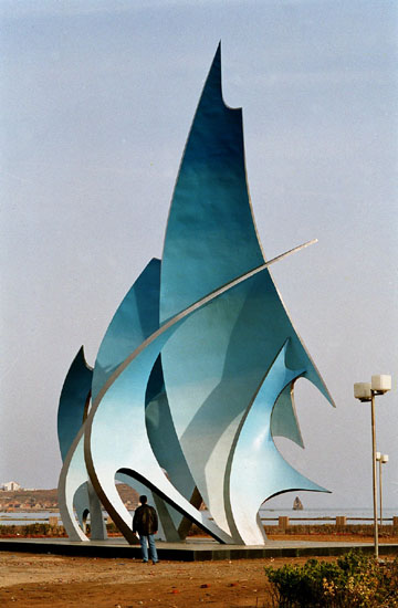 青島市環(huán)境藝術(shù)海濱大道東端的抽象雕塑《蘭色的帆》。本報(bào)記者 馮杰