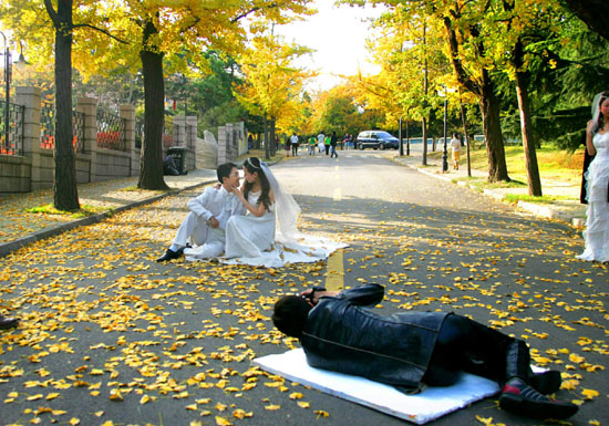 一對戀人在青島八大關(guān)景區(qū)內(nèi)拍攝婚紗照。新華社發(fā)