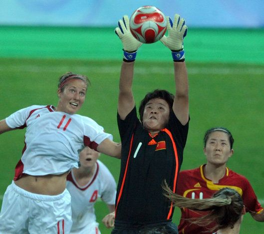 8月10日,中國隊守門員張艷茹在比賽中摘球。當(dāng)日,在天津奧林匹克中心體育場舉行的北京奧運會女足小組賽中,中國隊與加拿大隊1比1戰(zhàn)平。