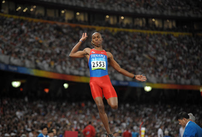 8月16日,巴拿馬選手歐文·哈伊爾·薩拉迪諾·阿蘭達在男子跳遠及格賽中。當日,北京奧運會田徑比賽在國家體育場“鳥巢”繼續(xù)進行。