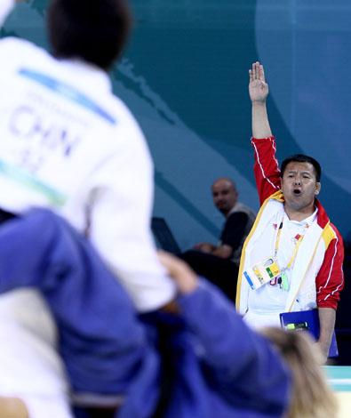 8月10日,中國女子柔道運動員冼東妹的教練傅國義在比賽現(xiàn)場指導(dǎo)。冼東妹在北京奧運會女子柔道52公斤級決賽中戰(zhàn)勝朝鮮選手安琴愛,成功衛(wèi)冕柔道奧運會冠軍,創(chuàng)造了中國體育的歷史。