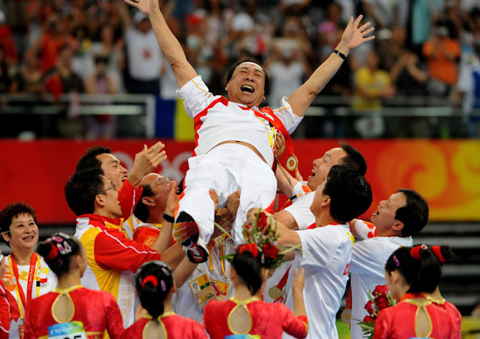 8月13日,中國隊在國家體育館創(chuàng)造歷史。中國隊在北京奧運會體操女子團體決賽中以188.900分的成績奪得冠軍。這是賽后隊員為主教練陸善真(上)戴上金牌,然后將他拋起慶祝勝利。