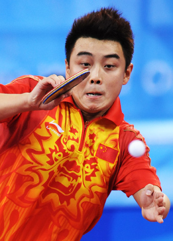8月16日,中國選手王皓在比賽中。當(dāng)日,中國隊(duì)在北京奧運(yùn)會乒乓球男團(tuán)半決賽中以3比0戰(zhàn)勝韓國隊(duì),挺進(jìn)決賽,將于18日與德國隊(duì)爭奪金牌。