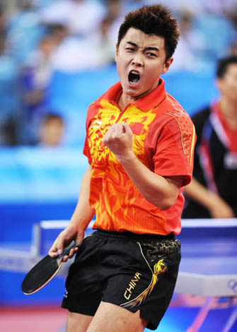 8月16日,中國(guó)選手王皓在比賽中慶祝得分。當(dāng)日,中國(guó)隊(duì)在北京奧運(yùn)會(huì)乒乓球男團(tuán)半決賽中以3比0戰(zhàn)勝韓國(guó)隊(duì),挺進(jìn)決賽,將于18日與德國(guó)隊(duì)爭(zhēng)奪金牌。