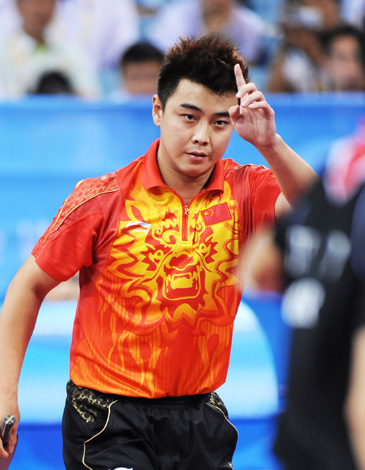 8月16日,中國選手王皓在比賽中。當日,中國隊在北京奧運會乒乓球男團半決賽中以3比0戰(zhàn)勝韓國隊,挺進決賽,將于18日與德國隊爭奪金牌。