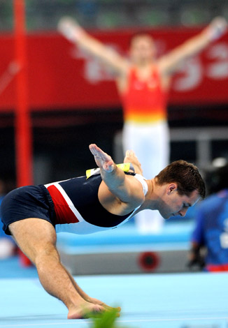 8月9日,美國(guó)選手喬伊·哈格蒂在北京奧運(yùn)會(huì)體操男子自由操資格賽第一場(chǎng)比賽中取得15.275分的成績(jī)。這是他在賽前仍然一絲不茍地練習(xí)動(dòng)作。