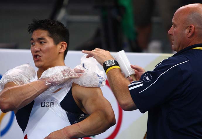 8月9日,美國體操隊員譚凱文在賽后敷冰袋,治療傷病。