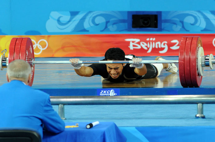8月12日,雅典奧運(yùn)會(huì)男子舉重69公斤級(jí)亞軍得主、韓國(guó)選手李培永在北京奧運(yùn)會(huì)舉重男子69公斤級(jí)決賽挺舉比賽中失誤,但仍緊緊抓住杠鈴。李培永在挺舉的三次試舉中,因?yàn)榈谝慌e受傷而導(dǎo)致最后兩舉功敗垂成,與獎(jiǎng)牌失之交臂。