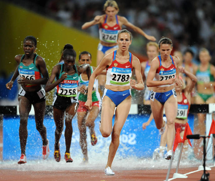 8月17日,選手們?cè)诒本⿰W運(yùn)會(huì)女子3000米障礙決賽中。當(dāng)日,俄羅斯選手古利娜拉·加爾金娜·薩米托(前中)以8分58秒81的成績奪得這個(gè)項(xiàng)目的金牌并打破世界紀(jì)錄。