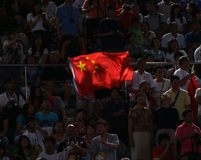 8月17日,北京奧運(yùn)會(huì)體操單項(xiàng)決賽在國(guó)家體育館進(jìn)行。這是觀眾在看臺(tái)上舞動(dòng)五星紅旗為中國(guó)運(yùn)動(dòng)員加油。
