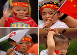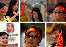 漫步北京街頭,不時可見北京市民、游客手中的國旗、臉上的貼紙,他們用這種時尚的方式為中國運(yùn)動員加油、為奧運(yùn)喝彩。