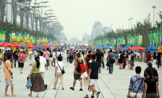 8月17日,人們在奧林匹克公園景觀大道游覽。當(dāng)日,4萬觀眾來到北京奧林匹克公園游覽。占地1000多公頃的北京奧林匹克公園包括奧林匹克森林公園、景觀大道、國家體育館、國家體育場、國家游泳中心和運(yùn)動員村等設(shè)施。