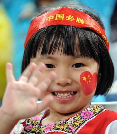 這是一位來自云南大理的小“金花”在網(wǎng)球賽場為比賽加油(8月14日攝)。