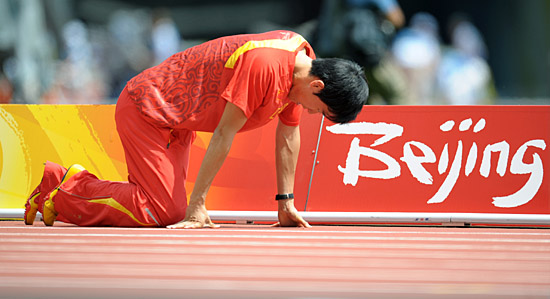 | 8月18日,中國選手劉翔在比賽前進(jìn)行上場準(zhǔn)備時(shí)感到不適。當(dāng)日,劉翔在北京奧運(yùn)會(huì)男子110米欄第一輪比賽中,因?yàn)槟_跟之傷退出比賽。新華社記者