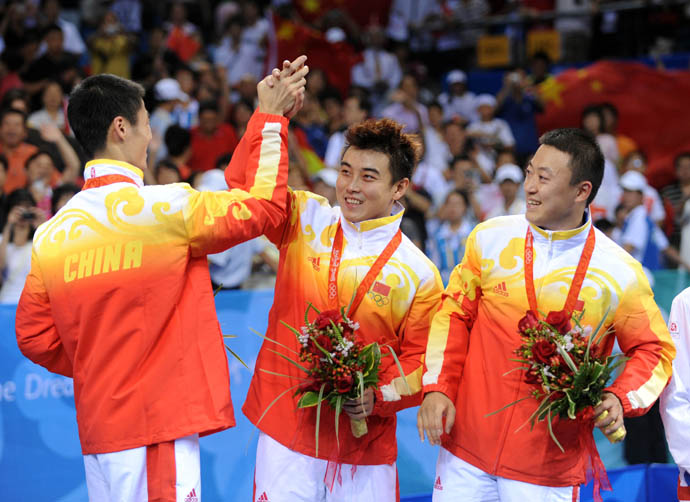 8月18日,中國選手王勵勤(左)、王皓(中)、馬琳歡慶勝利。當(dāng)日,中國隊在北京奧運會乒乓球男子團體決賽中以3比0戰(zhàn)勝德國隊,摘得金牌。