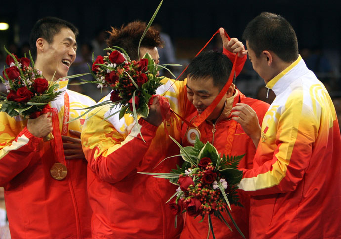 8月18日,中國隊員王勵勤(左一)、王皓(左二)、馬琳(右一)把金牌掛到主教練劉國梁的脖子上。當(dāng)日,中國隊在北京奧運會乒乓球男子團體決賽中以3比0戰(zhàn)勝德國隊,摘得金牌。