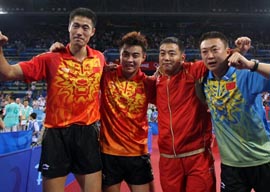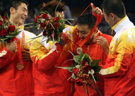 8月18日,中國(guó)隊(duì)在北京奧運(yùn)會(huì)乒乓球男子團(tuán)體決賽中以3比0戰(zhàn)勝德國(guó)隊(duì),摘得金牌。