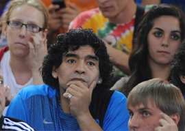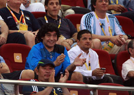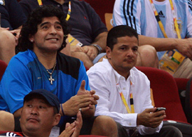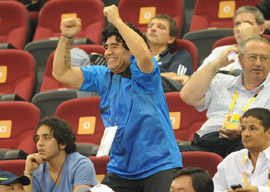 8月18日,阿根廷著名足球明星馬拉多納前來觀看阿根廷男籃與俄羅斯比賽。