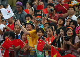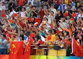 8月18日,觀眾在看臺上為選手加油助威。當(dāng)日,北京奧運(yùn)會體操單項(xiàng)決賽和女子蹦床決賽在國家體育館進(jìn)行。