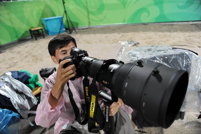 8月18日,新華社哈薩克族攝影記者沙達(dá)提在北京沙灘排球場內(nèi)與美聯(lián)社、法新社等多家媒體一起忙碌地處理圖片。