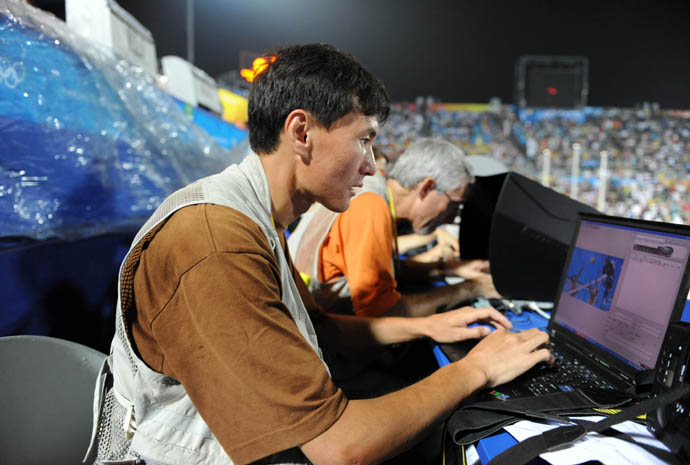 8月18日,新華社哈薩克族攝影記者沙達(dá)提在北京沙灘排球場(chǎng)內(nèi)與美聯(lián)社、法新社等多家媒體一起忙碌地處理圖片。