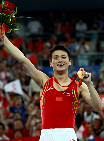 8月19日,中國(guó)選手陸春龍?jiān)陬C獎(jiǎng)儀式上慶祝。當(dāng)日,在國(guó)家體育館進(jìn)行的北京奧運(yùn)會(huì)男子蹦床決賽中,陸春龍以41.00分的成績(jī)奪得冠軍。
