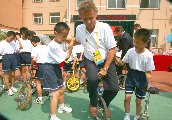 8月19日,智利代表團(tuán)團(tuán)長海梅·阿利亞蒂在西羅園五小學(xué)生的幫助下,學(xué)習(xí)騎獨(dú)輪車。當(dāng)日,幾位參加北京奧運(yùn)會(huì)的智利客人來到“同心結(jié)”學(xué)!髁_園五小參觀,向孩子們學(xué)習(xí)剪紙、捏面人和書法等中國傳統(tǒng)藝術(shù)。