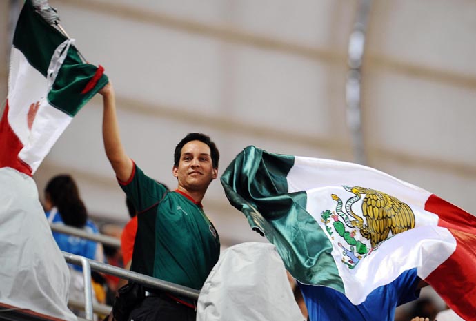 8月19日,外國觀眾在“鳥巢”看臺上展開國旗,為選手們助威加油。北京奧運(yùn)會田徑比賽在國家體育場漸入高潮,前來“鳥巢”觀賽的觀眾們更是熱情高漲。