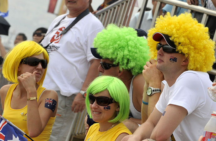8月19日,頭戴艷麗假發(fā)的澳大利亞“船迷”在觀看比賽。