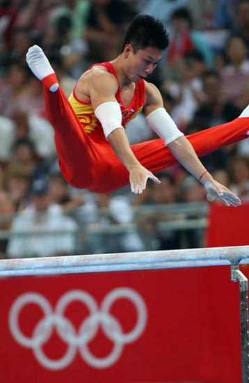 中國(guó)選手李小鵬在雙杠決賽中