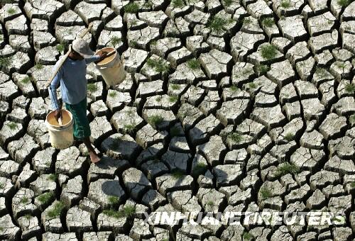 8月20日,在印度尼西亞東爪哇省的拉蒙岸,為牲畜取水的村民手持空桶走過(guò)干涸的水壩。新華社/路透