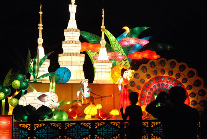 8月20日晚,游人在燈展上拍照留念。奧運會期間,北京地壇公園的大型燈展活動吸引了不少游客。此次燈展既有“福娃”乖巧伶俐的運動造型,也有“相約2008”和體育剪紙燈組,來自我國不同地區(qū)、具有民族特色的燈飾也在燈展上亮相。據(jù)介紹,整個活動將持續(xù)到8月22日。