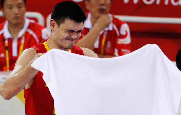 中國隊隊員姚明在比賽后的表情(8月20日攝)。