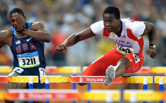 8月21日,古巴選手羅伯斯(右)在男子110米欄決賽中以12秒93的成績奪得金牌。