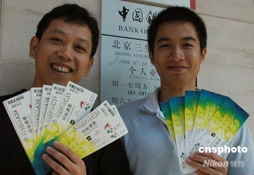 8月15日,2008年北京殘奧會(huì)體育比賽門(mén)票在北京地區(qū)的30個(gè)中國(guó)銀行門(mén)票代售網(wǎng)點(diǎn)銷(xiāo)售,并提供現(xiàn)場(chǎng)打印門(mén)票服務(wù)。公眾持有效身份證件在代售網(wǎng)點(diǎn)排隊(duì)實(shí)時(shí)購(gòu)票,每人每次最多買(mǎi)2個(gè)場(chǎng)次共10張門(mén)票。目前共有205個(gè)比賽場(chǎng)次80萬(wàn)張比賽門(mén)票供銷(xiāo)售,購(gòu)票時(shí)間截至到9月17日。圖為來(lái)自廣東的民眾高興地買(mǎi)到殘奧會(huì)門(mén)票。 中新社發(fā) 張雙雙 攝