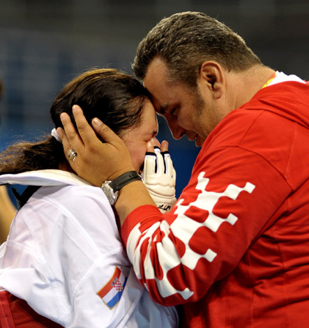 8月22日,克羅地亞選手薩里奇在北京奧運(yùn)會(huì)跆拳道女子67公斤級(jí)銅牌爭(zhēng)奪戰(zhàn)中獲勝后,與教練一起慶祝。