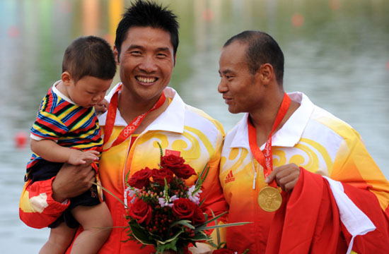 8月23日,孟關(guān)良和楊文軍在北京順義奧林匹克水上公園再次掛上了奧運(yùn)金牌。 當(dāng)白色的船艇剛觸碰到終點(diǎn)線,孟關(guān)良和楊文軍就摔落到了水里。“實(shí)在是太累了,身體已經(jīng)到極限。剛沖過終點(diǎn),我就再也無法堅(jiān)持跪在艇上了。”在混合區(qū),孟關(guān)良對于自己落水這樣對新華社記者說。 賽后,兩人的加拿大教練馬克告訴記者,2周前孟關(guān)良的背部就出現(xiàn)了問題。賽前沒有人知道孟關(guān)良還能否出現(xiàn)在奧運(yùn)賽場上。不過,“他們堅(jiān)持下來了,是用心在比,表現(xiàn)非常好!敝,馬克激動地說。 男子雙人劃艇500米的頒獎儀式是當(dāng)天倒數(shù)第二個舉行。當(dāng)孟關(guān)良和楊文軍掛著閃閃的金牌面朝五星紅旗時,順義奧利匹克水上公園上空響起了熟悉的《義勇軍進(jìn)行曲》。當(dāng)觀眾們在為兩人歡呼雀躍時,也許只有孟關(guān)良和楊文軍自己才明白這枚金牌多么來之不易。 “我和他們壓力都很大。4年前奪冠可以說沒什么壓力,但今天不一樣。”看到兩人第一個沖過終點(diǎn)后,馬克說。 作為上屆雅典奧運(yùn)會男子雙人劃艇500米衛(wèi)冕冠軍,孟關(guān)良和楊文軍一出現(xiàn)在起航線上,就引起了看臺上無數(shù)中國觀眾的歡呼。當(dāng)天比賽,孟關(guān)良和楊文軍身穿紅黃相間的中國隊(duì)服站在了第5道前。2007年世錦賽冠軍的德國組合克里斯蒂安·吉勒/托馬斯·維倫策克,和預(yù)賽中僅落后兩人0.023秒的俄羅斯組合分列第4道和第3道。 一起航,孟關(guān)良和楊文軍很快便顯示了衛(wèi)冕冠軍的實(shí)力。50米過后,逐漸擺脫各艇,率先占據(jù)領(lǐng)先位置,德國隊(duì)列第三。然而,兩人的衛(wèi)冕之路并非毫無懸念。250米過后,位于第3道的俄羅斯組合謝爾蓋·烏列金/亞歷山大·科斯托格洛德開始加快速度,從第四位一下躍居第二,并且直逼中國隊(duì)。不過,孟關(guān)良和楊文軍在最后50米的奮力沖刺挺住了俄羅斯隊(duì)的沖擊,第一個沖過終點(diǎn),成績是1分41秒025。俄羅斯組合獲得銀牌,德國隊(duì)名列第三。 紅地毯上的最高領(lǐng)獎臺上,當(dāng)孟關(guān)良和楊文軍在鎂光燈前露出勝利笑臉時,突然出現(xiàn)的一位小客人引起了在場所有人的歡呼。孟關(guān)良15個月大的兒子被抱上了領(lǐng)獎臺。當(dāng)站在臺上的孟關(guān)良從妻子手中接過兒子后,臉上燦爛的喜悅不僅僅來自于胸前掛著的金牌。而一家三口和自己親密“戰(zhàn)友”面對國旗的合影,成為北京奧運(yùn)會皮劃艇收官之日的一幕經(jīng)典。