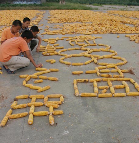 8月23日,江蘇省海安縣大公鎮(zhèn)的幾名農(nóng)村兒童在曬場上,用正在晾曬的玉米棒擺出“奧運加油”、“中國必勝”等字樣和奧運五環(huán)圖案,以此表達對北京奧運會的祝福。