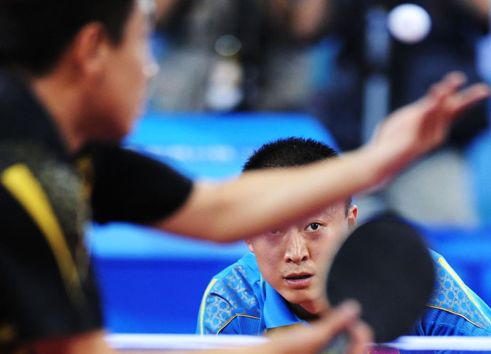 8月23日,中國選手馬琳準(zhǔn)備接對方的發(fā)球。當(dāng)日,馬琳在北京奧運會乒乓球男子單打決賽中以4比1戰(zhàn)勝隊友王皓,獲得金牌。