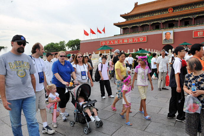 8月23日,幾位外國游客在天安門城樓前游覽。隨著北京奧運(yùn)會(huì)即將結(jié)束,大批外國人來到天安門廣場參觀游覽。