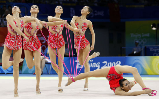 中國(guó)藝術(shù)體操新的歷史24日在北京工業(yè)大學(xué)體育館書(shū)寫(xiě)。中國(guó)姑娘們?cè)趭W運(yùn)會(huì)藝術(shù)體操比賽中,以35.225分歷史性地奪得集體全能銀牌,這也是中國(guó)藝術(shù)體操的首枚奧運(yùn)會(huì)獎(jiǎng)牌。 實(shí)力超群的俄羅斯隊(duì)以35.550分奪得金牌,再次包攬奧運(yùn)會(huì)藝術(shù)體操兩金。白俄羅斯隊(duì)以34.900分奪得銅牌。 北京奧運(yùn)會(huì)藝術(shù)體操項(xiàng)目設(shè)個(gè)人全能和集體全能兩枚金牌。此前,中國(guó)藝術(shù)體操的歷史最好成績(jī)是亞特蘭大奧運(yùn)會(huì)的第五名。24日的決賽中,中國(guó)藝術(shù)體操姑娘們?cè)诩议T(mén)口大放異彩。她們動(dòng)作編排精美,整體配合默契,在首輪5繩比賽中,就奪得第三名,超過(guò)主要競(jìng)爭(zhēng)對(duì)手意大利隊(duì)0.575分。 次輪3圈+2棒的比賽中,伴著京劇傳統(tǒng)音樂(lè)開(kāi)場(chǎng),中國(guó)姑娘們時(shí)而如飛鳥(niǎo)凌空展翅,時(shí)而如孔雀驚艷開(kāi)屏,甜美的笑容打動(dòng)了全場(chǎng)觀眾。堪稱完美的表現(xiàn)令中國(guó)隊(duì)得分超過(guò)白俄羅斯隊(duì),一舉奪得集體全能銀牌。看著最終的得分大屏幕,中國(guó)藝體姑娘們高興地?fù)肀г谝黄穑蕹梢粓F(tuán)。她們創(chuàng)造了中國(guó)藝術(shù)體操新的歷史。 俄羅斯隊(duì)在決賽中再次展示了在藝術(shù)體操領(lǐng)域的“霸主”地位。兩輪的全場(chǎng)最高分讓她們?cè)俅伟鼣埩吮本⿰W運(yùn)會(huì)藝術(shù)體操的兩枚金牌。這也是從悉尼奧運(yùn)會(huì)開(kāi)始,俄羅斯隊(duì)連續(xù)三屆奧運(yùn)會(huì)實(shí)現(xiàn)個(gè)人全能和集體全能金牌的包攬。 賽后,中國(guó)隊(duì)的主力隊(duì)員章碩高興地說(shuō):“完全沒(méi)想到能拿到銀牌。我們創(chuàng)造了中國(guó)藝術(shù)體操最輝煌的一刻。為了這一刻,我們奮斗了這么久,吃了很多苦。今天,我們做到了最好。今天,所有付出都得到了回報(bào)! 對(duì)于奪得亞軍,中國(guó)隊(duì)教練白梅說(shuō):“其實(shí),中國(guó)隊(duì)的姑娘們訓(xùn)練特別艱苦,每天的訓(xùn)練都是在超越自己。今天的成績(jī)也是她們團(tuán)結(jié)一致、一起拼搏的結(jié)果!