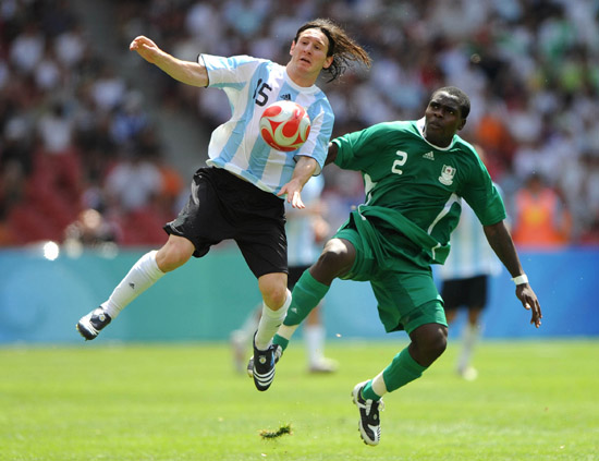 經(jīng)歷了巴塞羅那俱樂部與阿根廷隊的反復(fù)爭執(zhí),21歲的梅西終于如愿來到了奧運賽場!皡⒓訆W運始終是我唯一的選擇!泵肺髟趦煞降某镀ぶ斜3种鴪远ǖ臎Q心。 北京奧運會賽場上,梅西是阿根廷藍白風(fēng)暴的偉大導(dǎo)演,也是該隊區(qū)別于其他球隊的“核武器”。對科特迪瓦隊時,他用一次進球和一次助攻擊潰了強大的對手;對荷蘭隊的比賽中,他又用一個進球和一記助攻幫助球隊鎖定勝局;在3:0擊敗巴西隊的比賽中,梅西幾乎參與了每一次進球,與尼日利亞隊的決賽也是他的巧妙助攻幫助隊友攻入制勝球。 梅西不僅征服了球迷,還征服了更多體育界同行。NBA巨星科比已成為其粉絲,親自來看他比賽,還說梅西是所有運動員中最吸引他的,因為他在場上和別人都不一樣。尼日利亞隊隊員在頒獎儀式前甚至爭搶著和梅西合影。